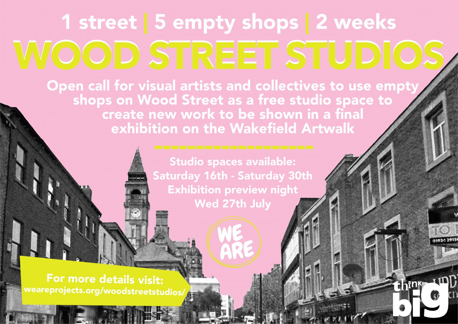 WE ARE have unlocked 5 empty shops on Wood Street in Wakefield for artists and collectives to use as free studio space. For 2 weeks artists have the opportunity to take over Wood Street in Wakefield and transform it into open artist studios.