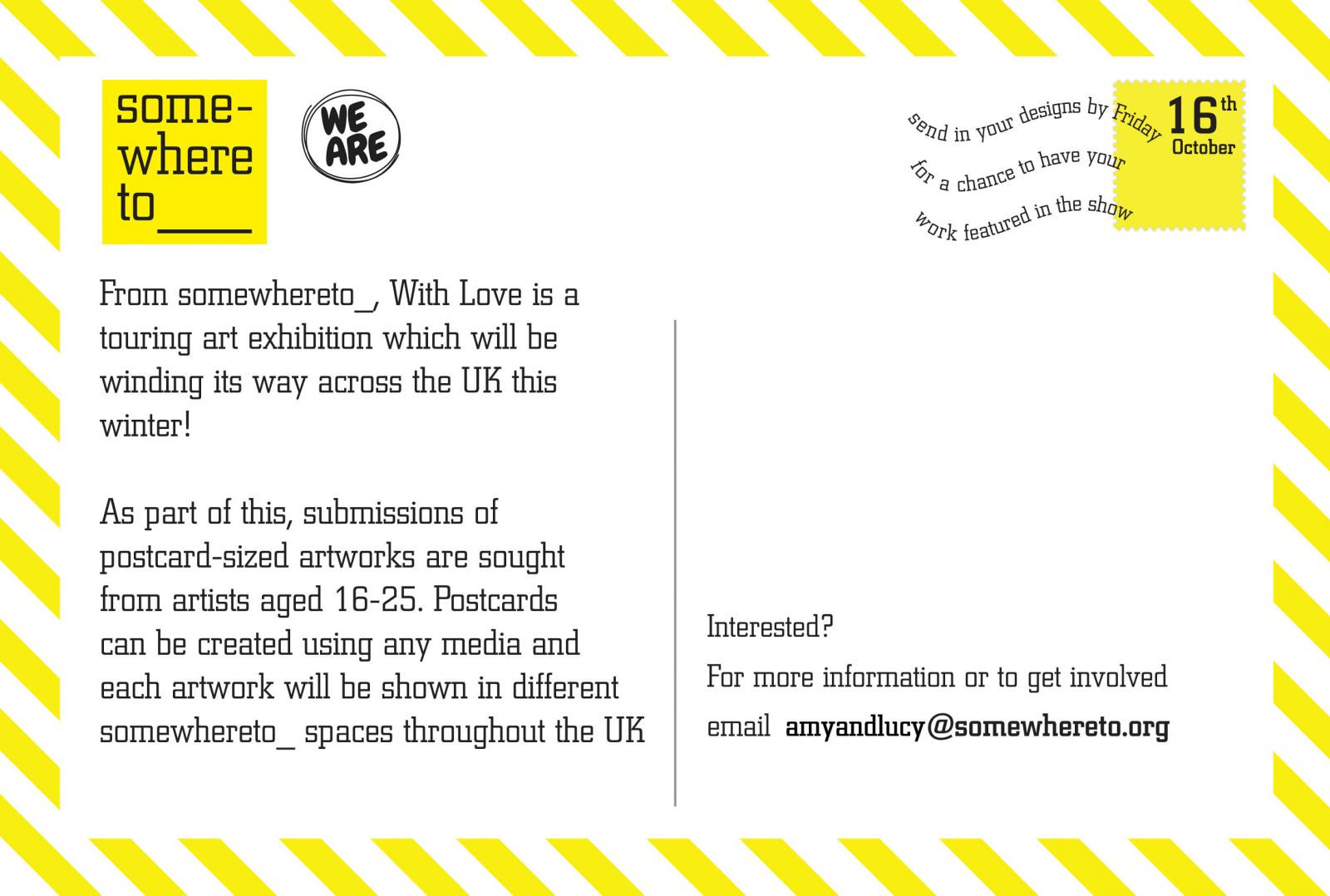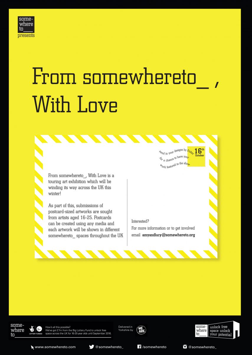 From somewhereto_, With Love is a touring art exhibition, winding its way across the UK this winter! As part of this, submissions of postcard-sized artworks are sought from emerging artists aged 16-25.