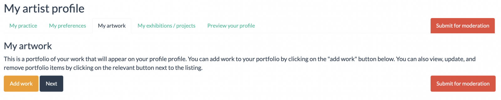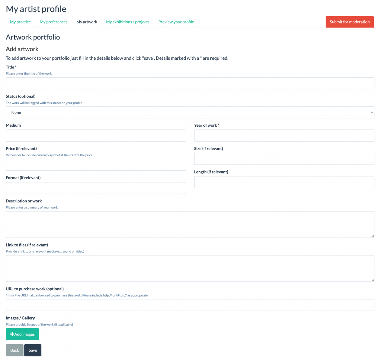 Click the "add work" button. This will open another page, called 'Artwork portfolio', which you can populate with all your details.