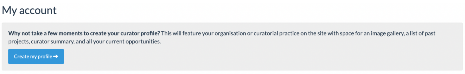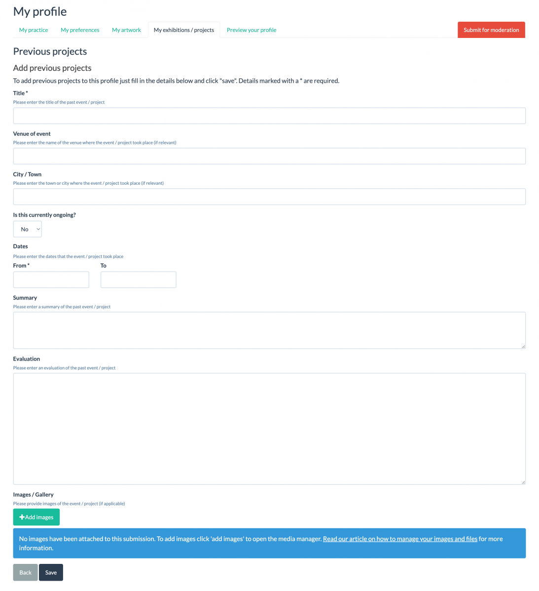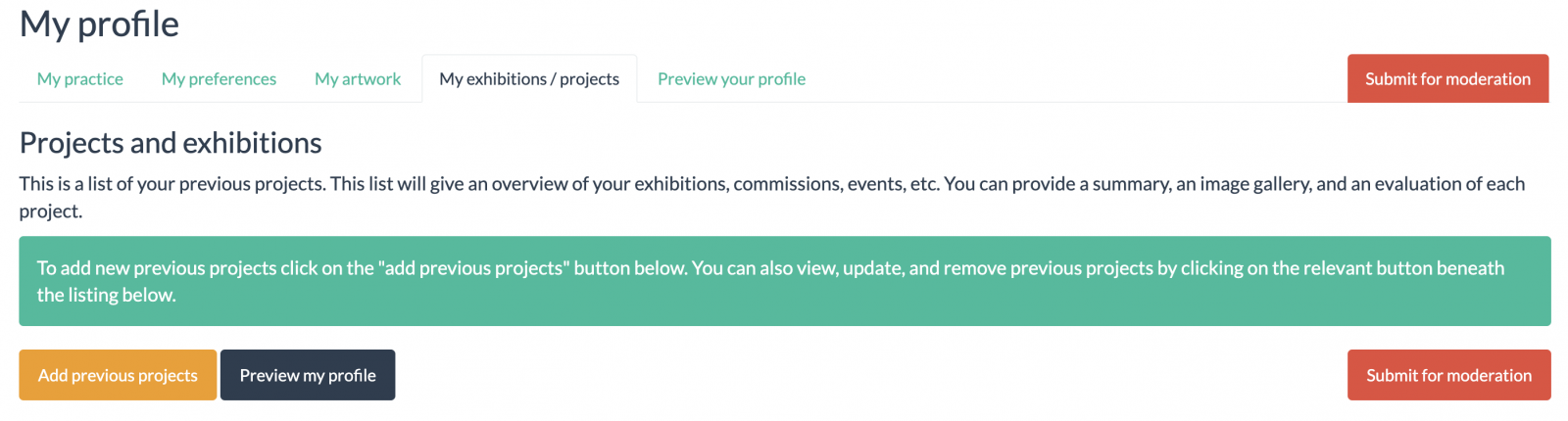 Finally, on the "My exhibitions/projects" page, you can add a list of your previous projects.