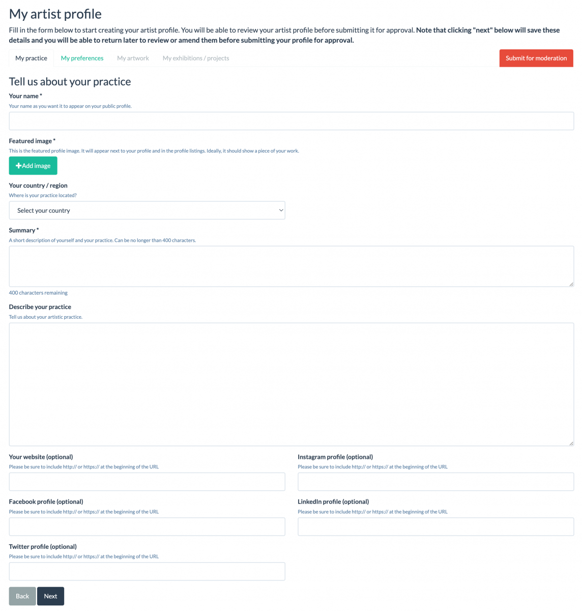 On the first page, "My Practice," you'll enter your name and choose a featured image. This image will be the first thing that curators see, so choose wisely! We recommend selecting a picture of your best or favourite work.