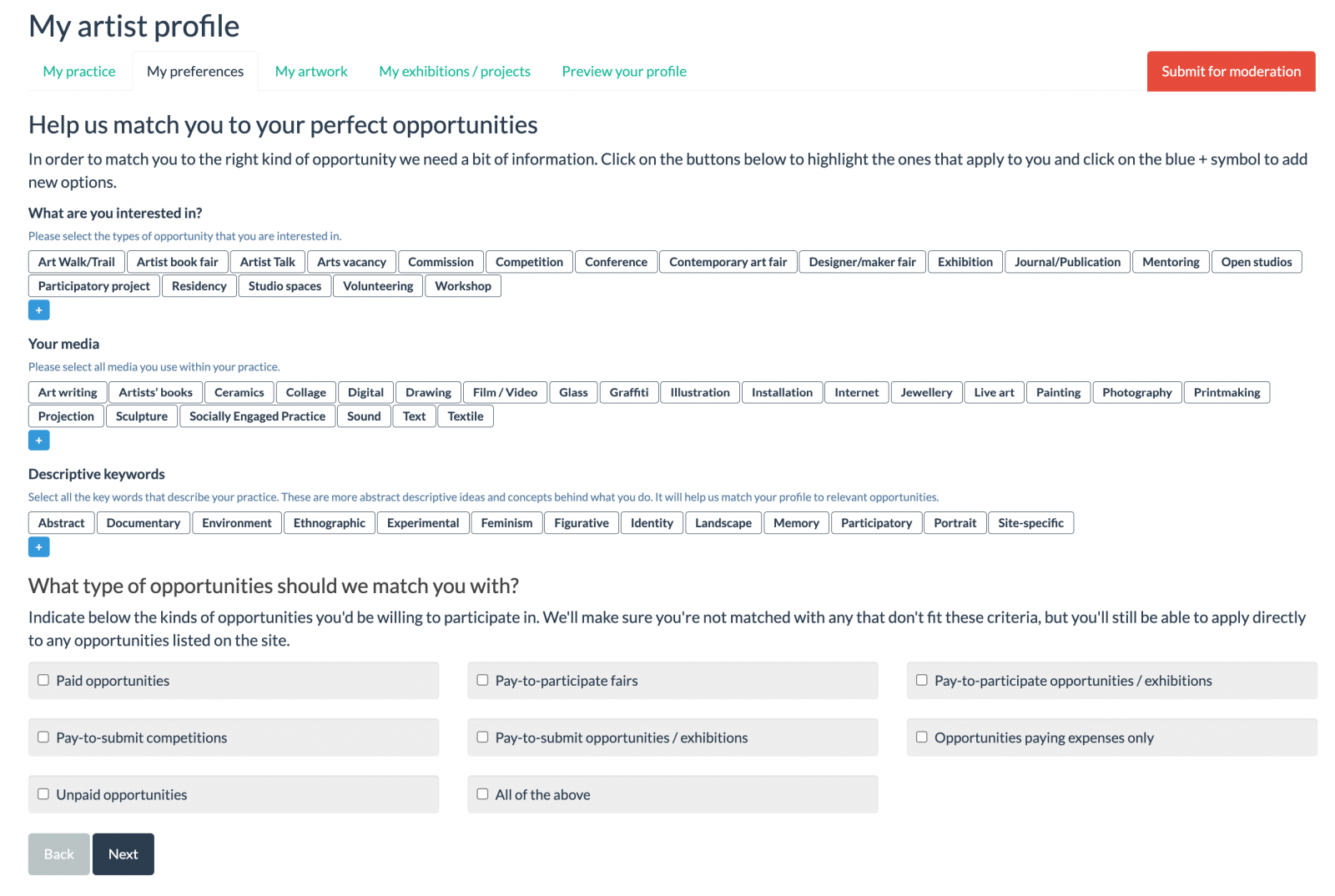 On the "My preferences" page, choose the areas you're interested in and the type of opportunities you'd like to be matched with.