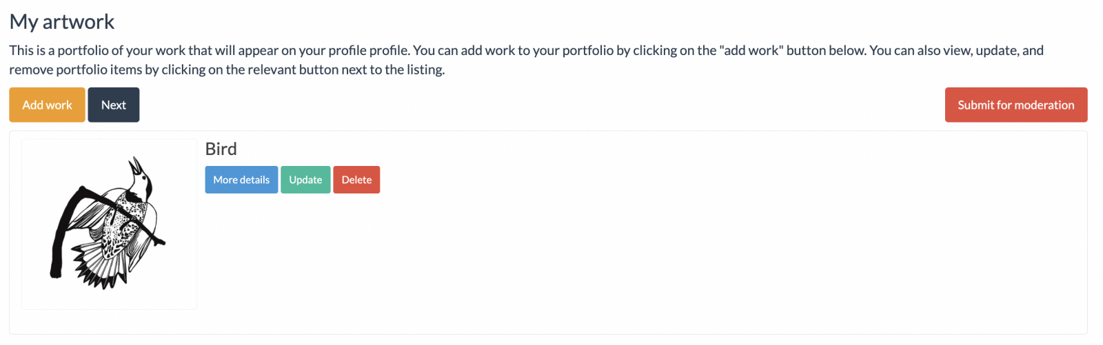 If you want to add more pieces, simply click the orange "add work" button again and repeat the process. You can view, update, or remove portfolio items by clicking on the relevant button next to the listing. This is helpful if you have sold a piece and want to replace it with new artwork.